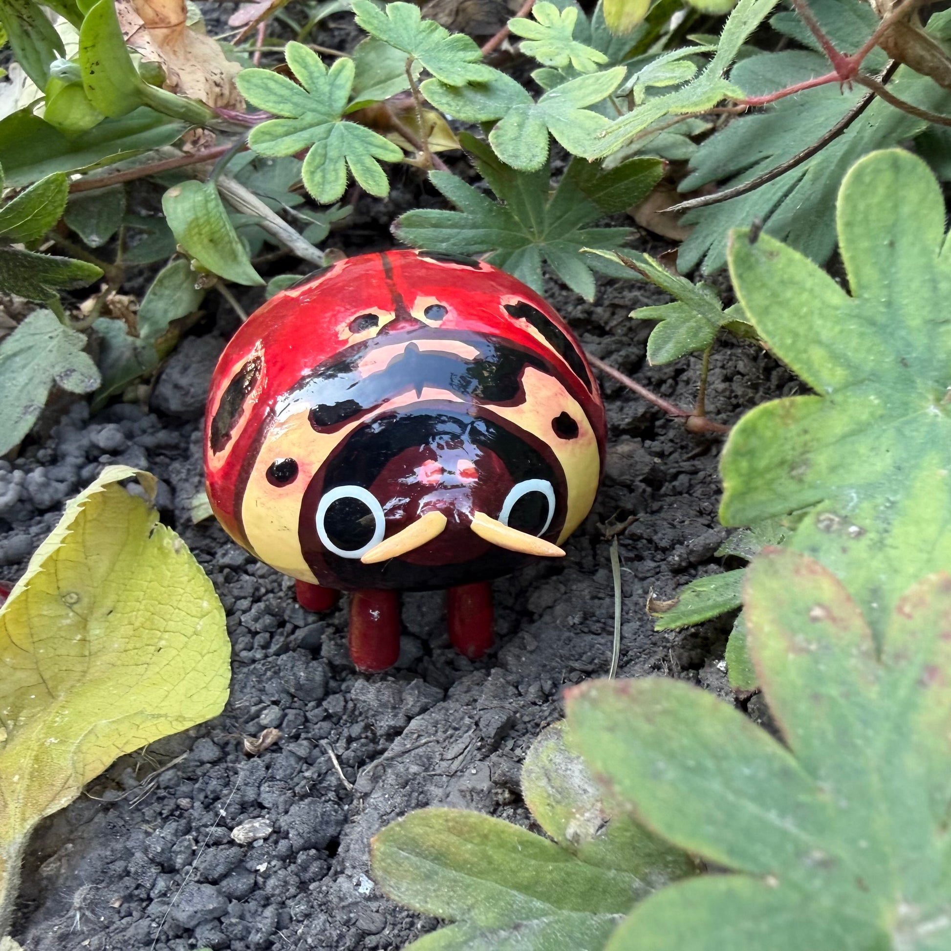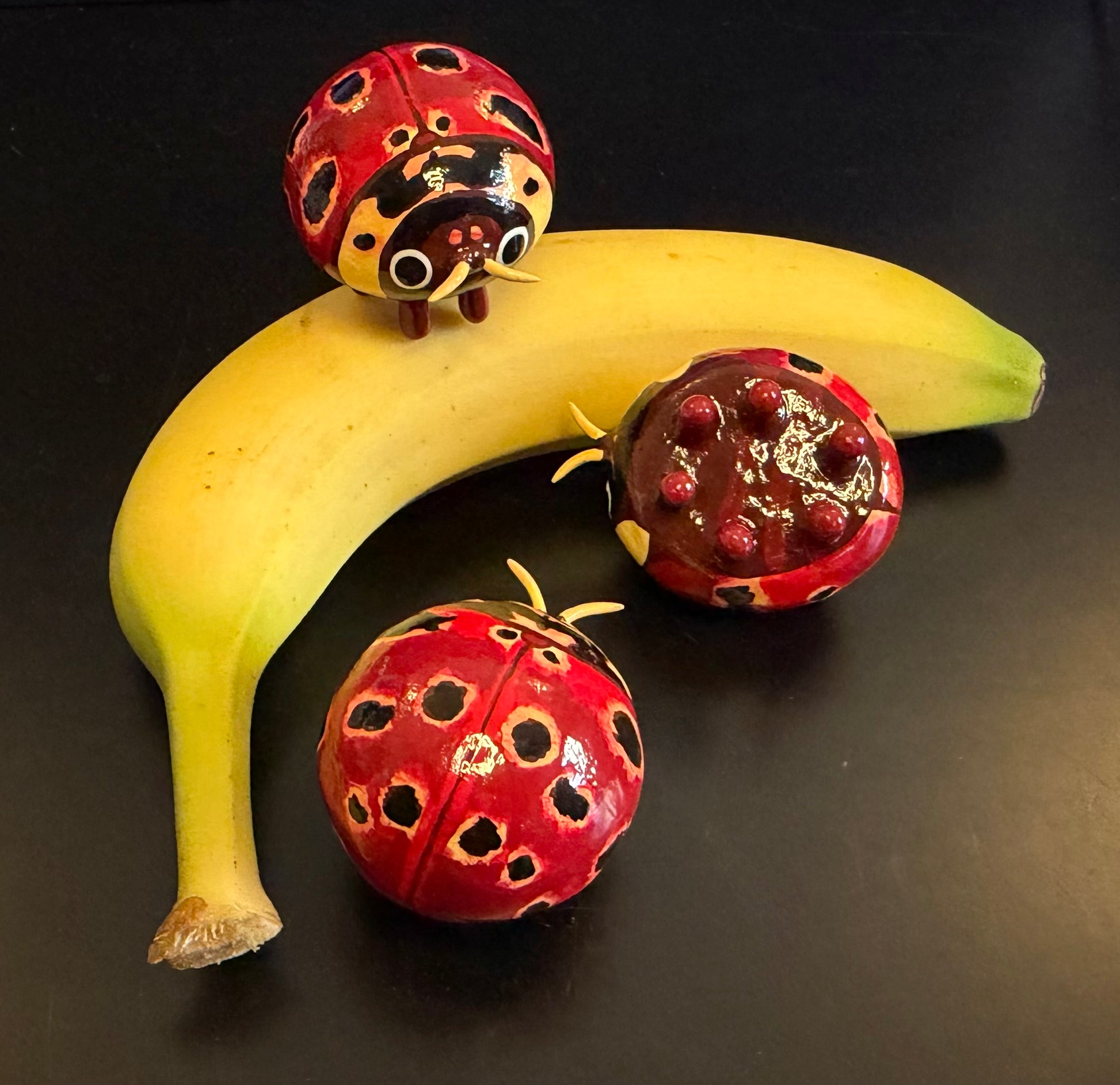Hand-sculpted Coccinelid sculpture made with polymer clay, hand-painted with acrylic paint, and sealed with glossy polyurethane.