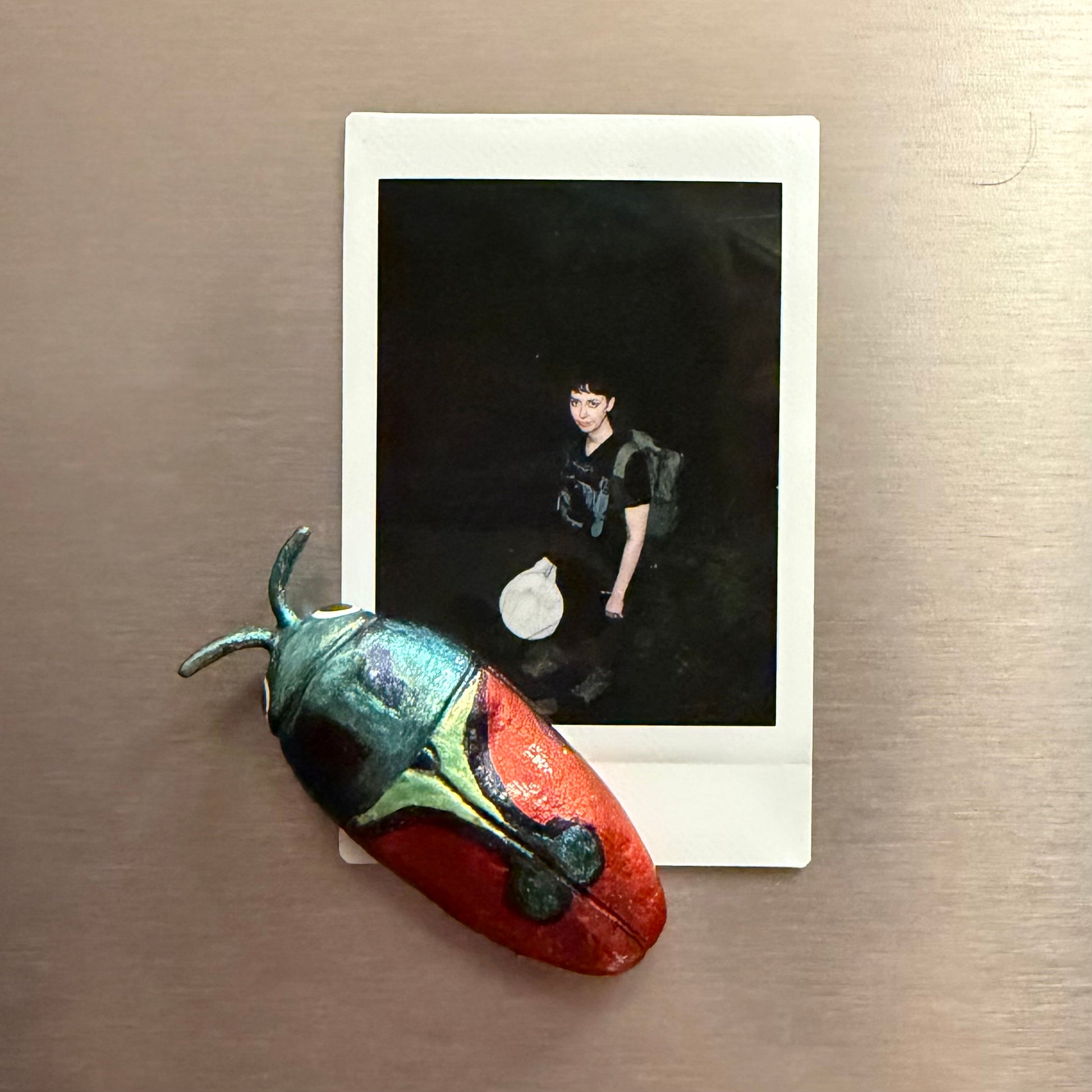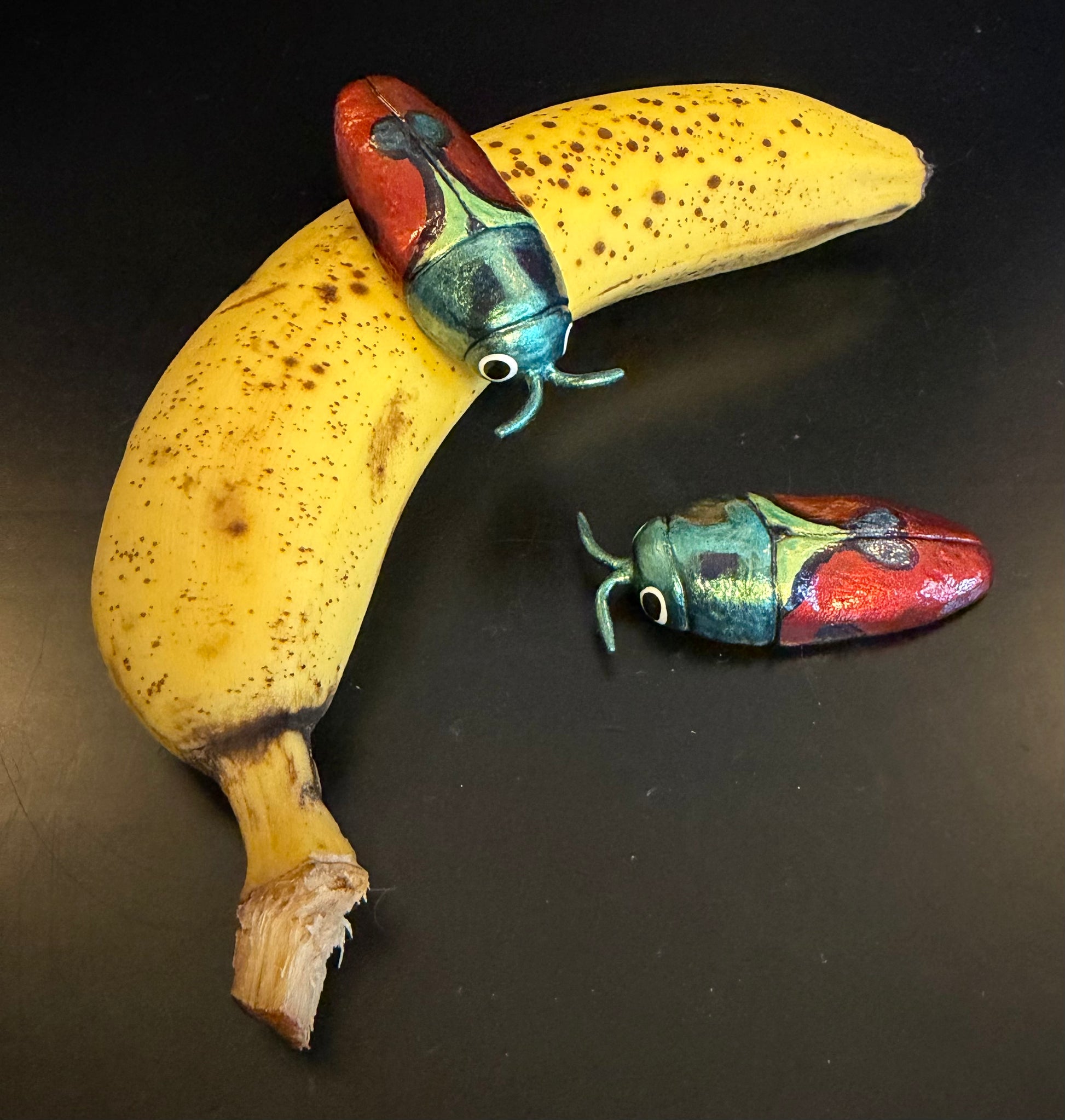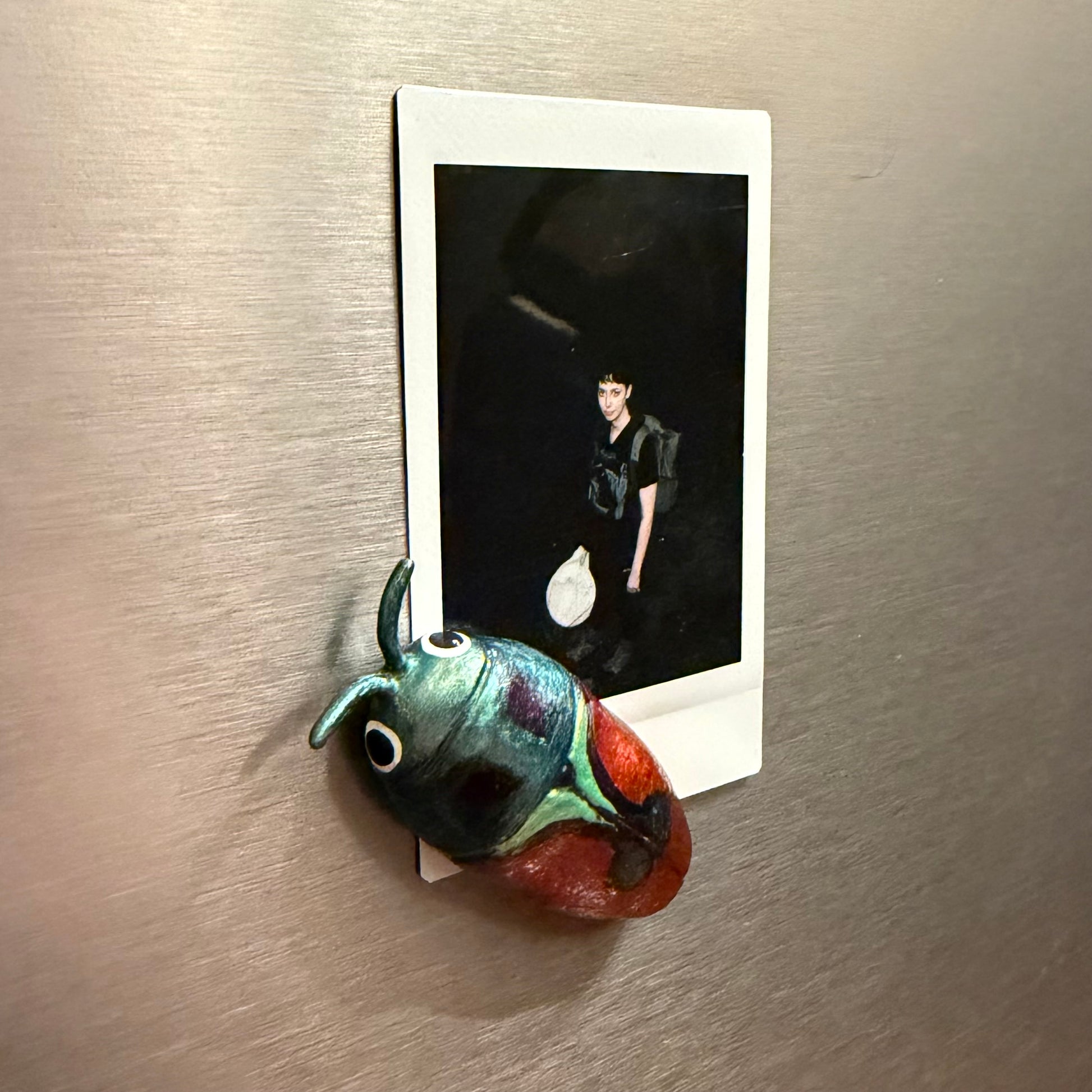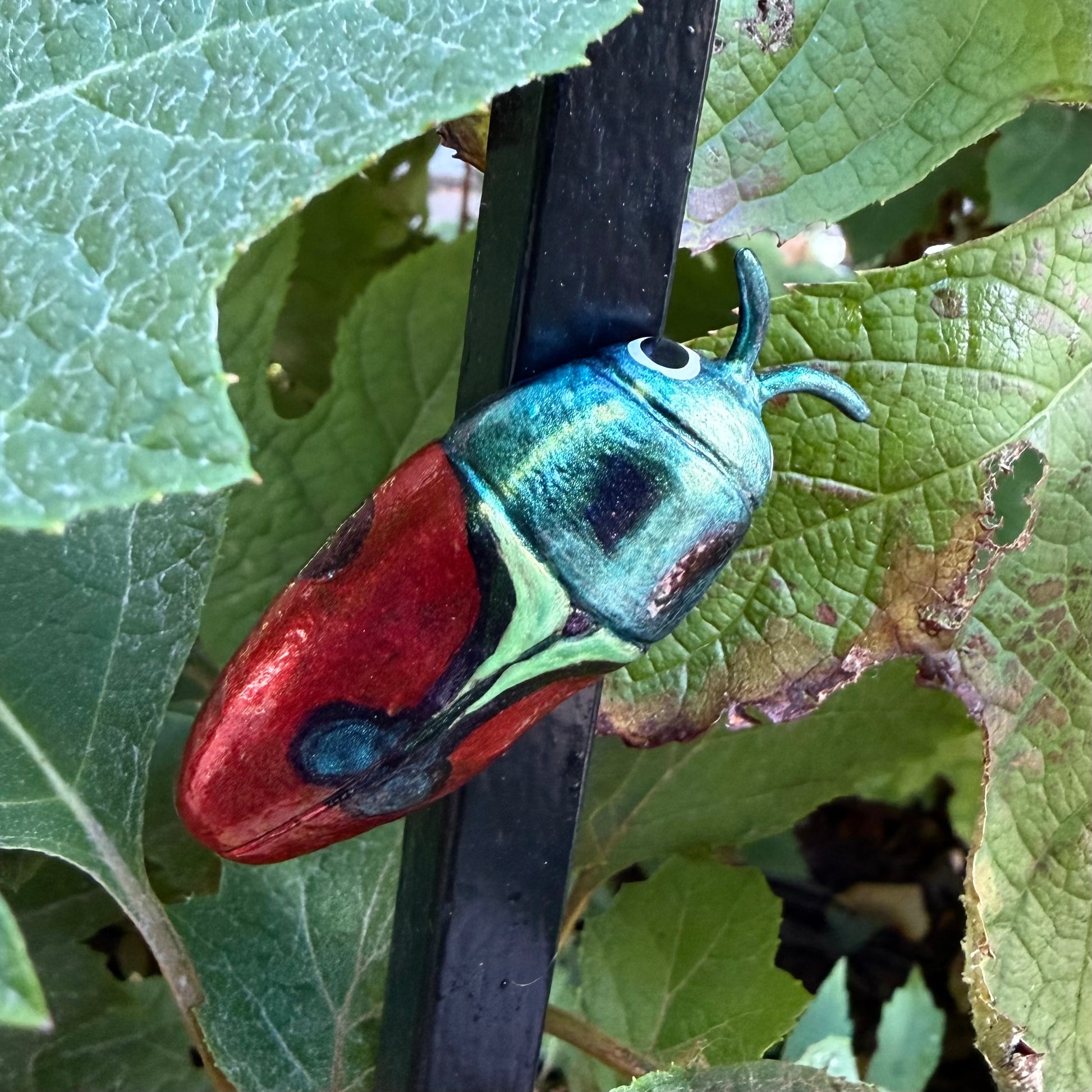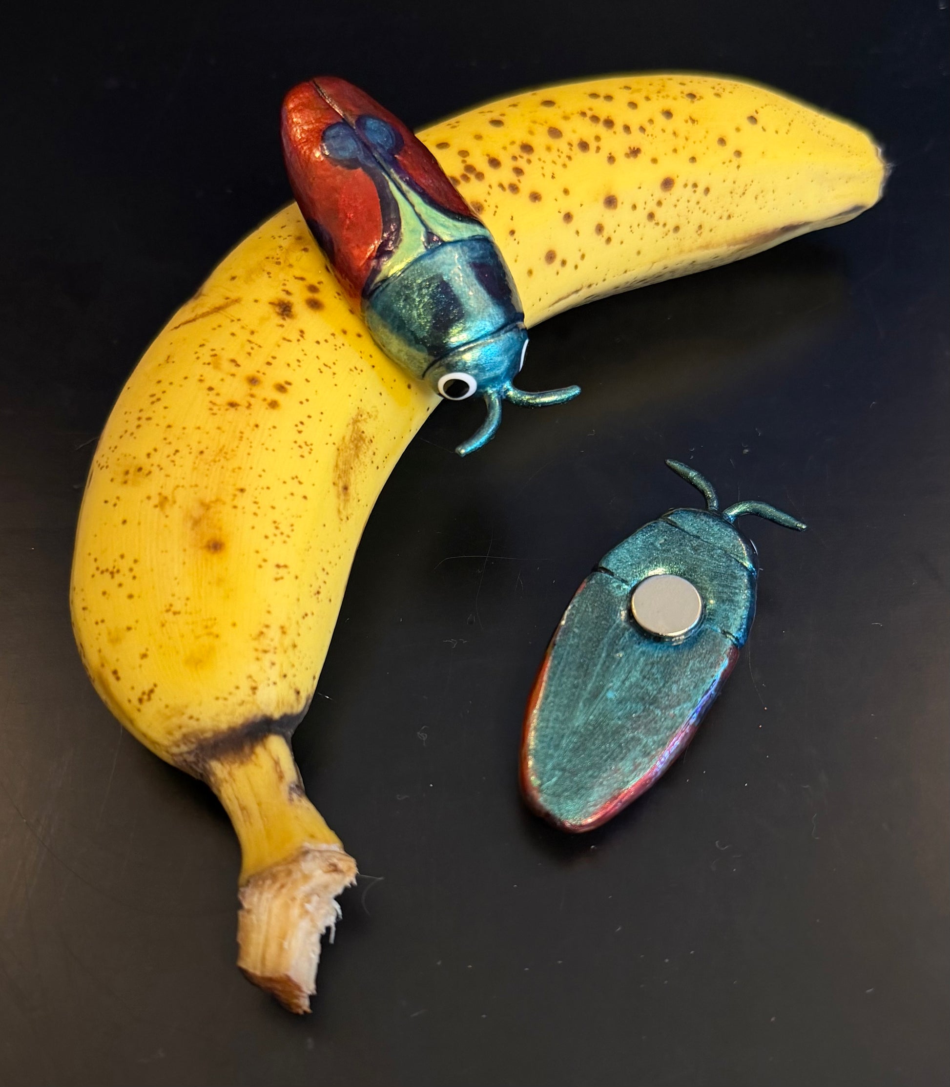 Hand-sculpted Buprestid (Jewel) beetle sculptures made with polymer clay, hand-painted with color-shifting metallic acrylic paint and sealed with glossy polyurethane. Each contains one rare-earth magnet.