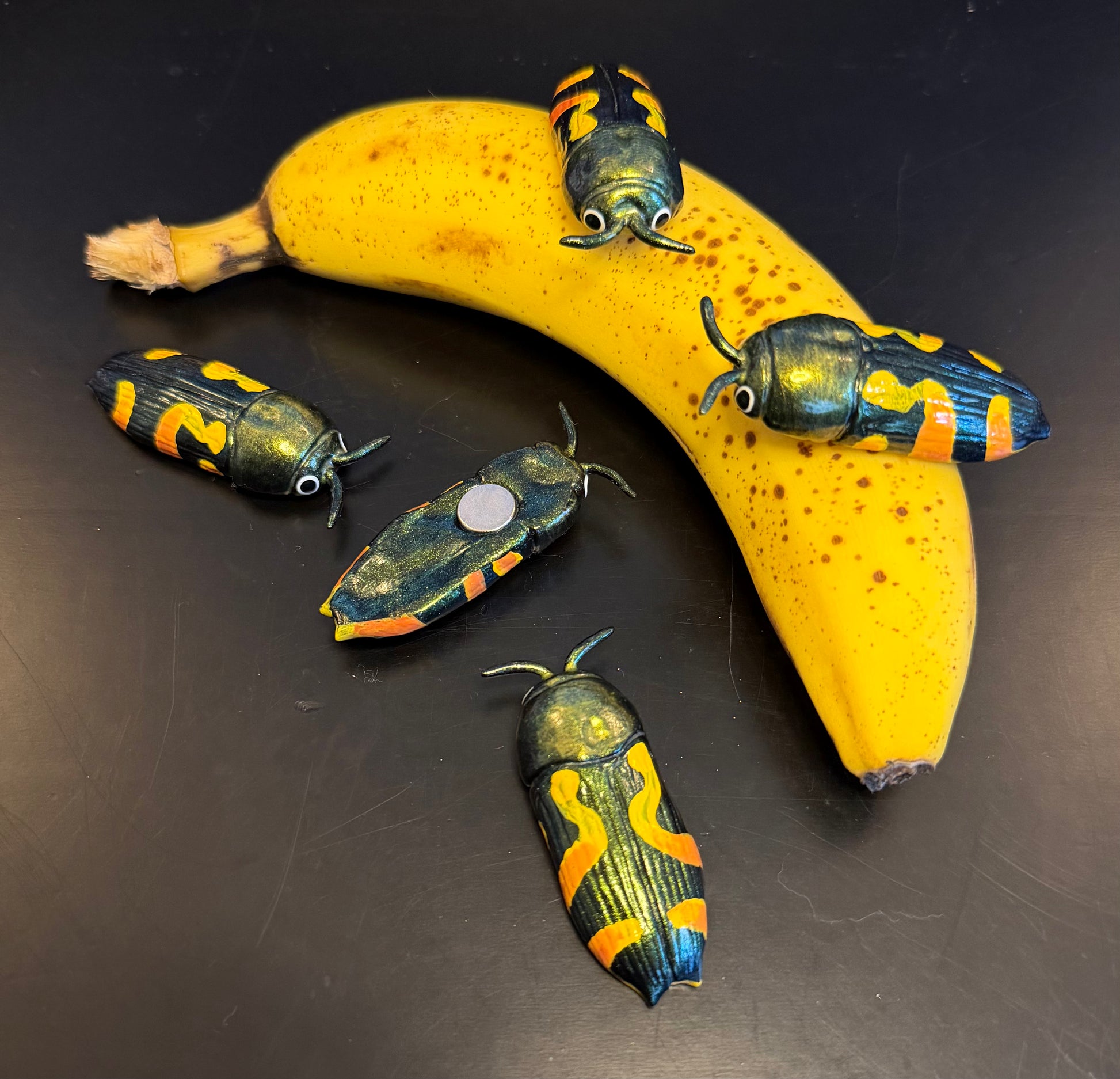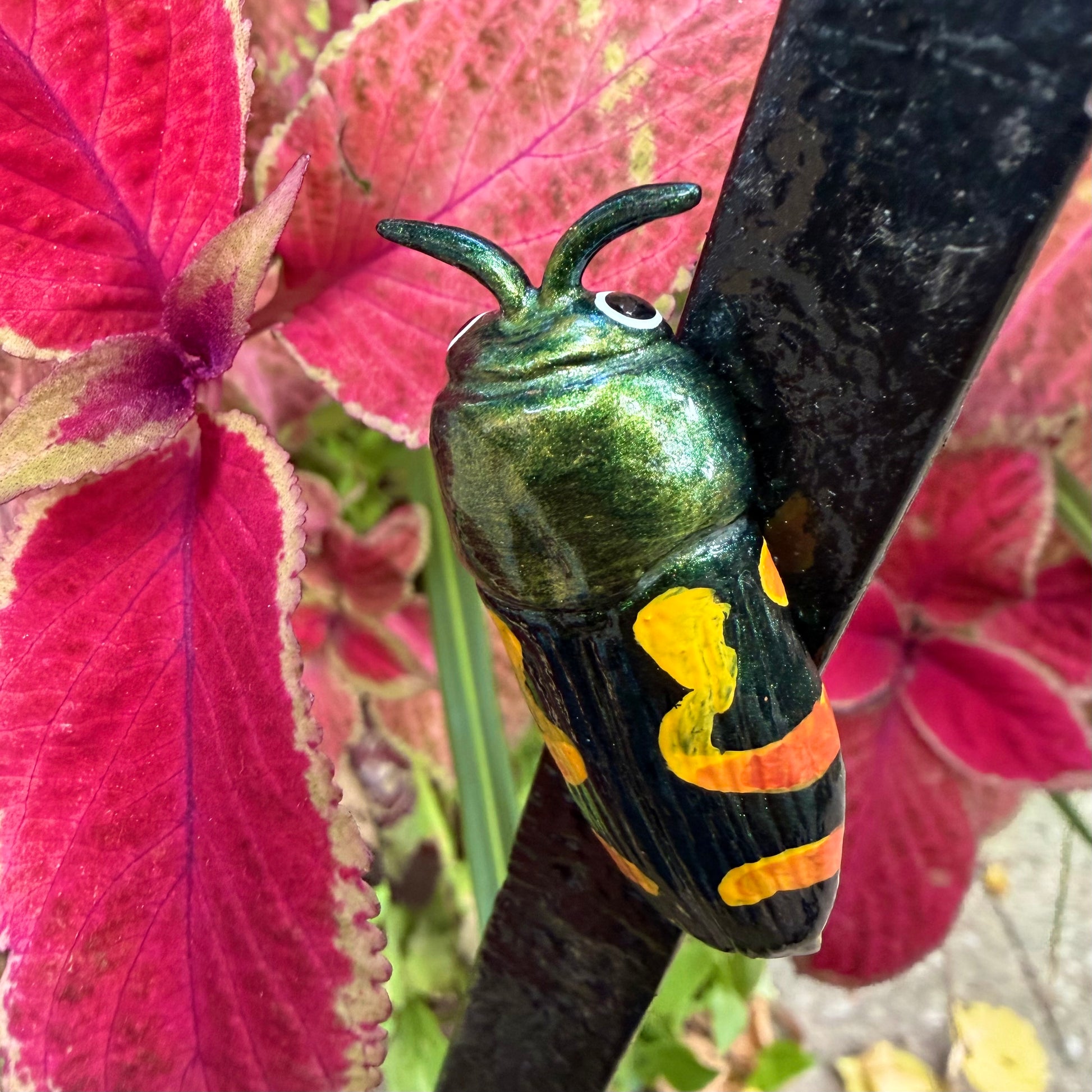 Hand-sculpted Buprestid (Jewel) beetle sculptures made with polymer clay, hand-painted with color-shifting metallic acrylic paint and sealed with glossy polyurethane. Each contains one rare-earth magnet.