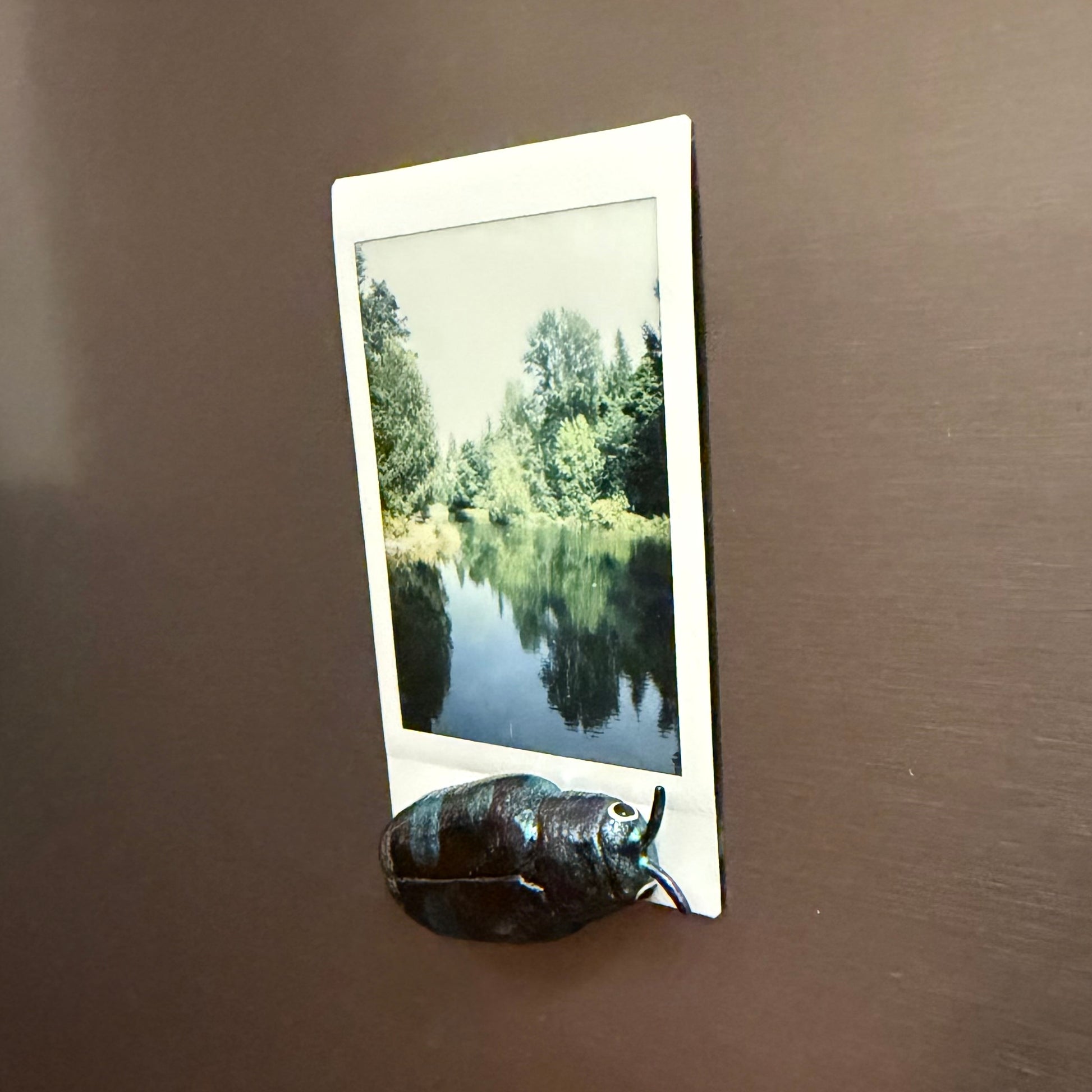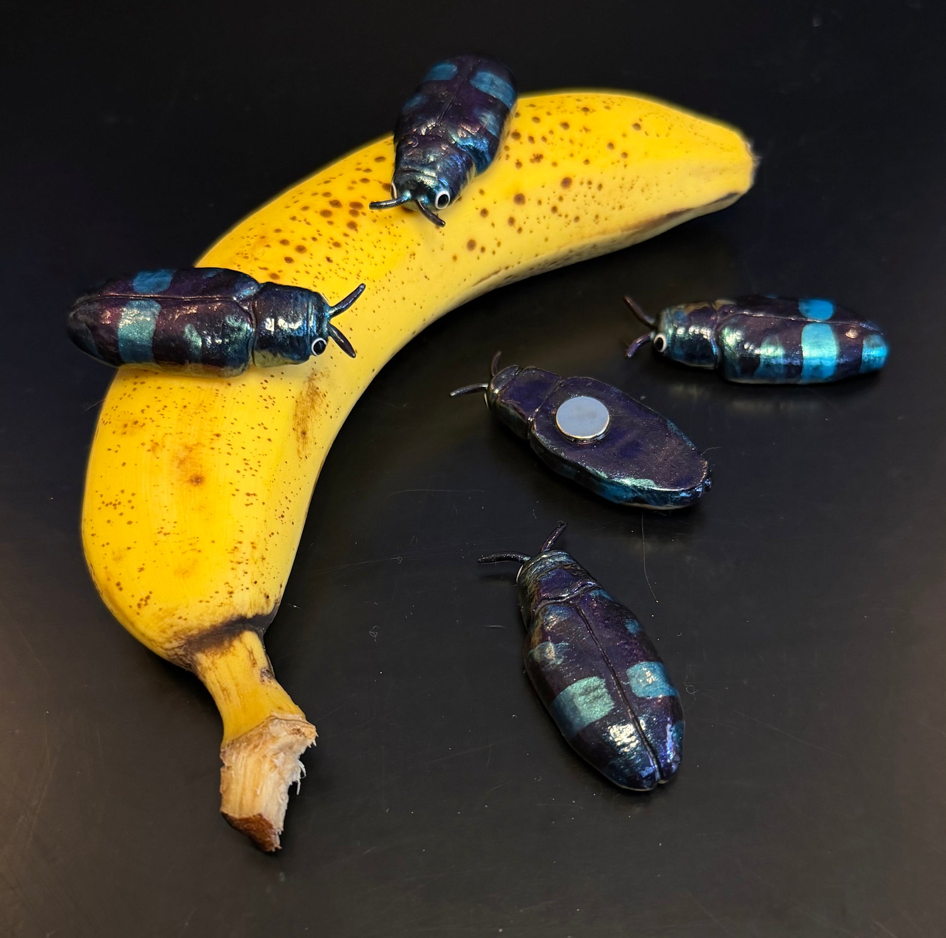 Hand-sculpted Buprestid (Jewel) beetle sculptures made with polymer clay, hand-painted with color-shifting metallic acrylic paint and sealed with glossy polyurethane. Each contains one rare-earth magnet.