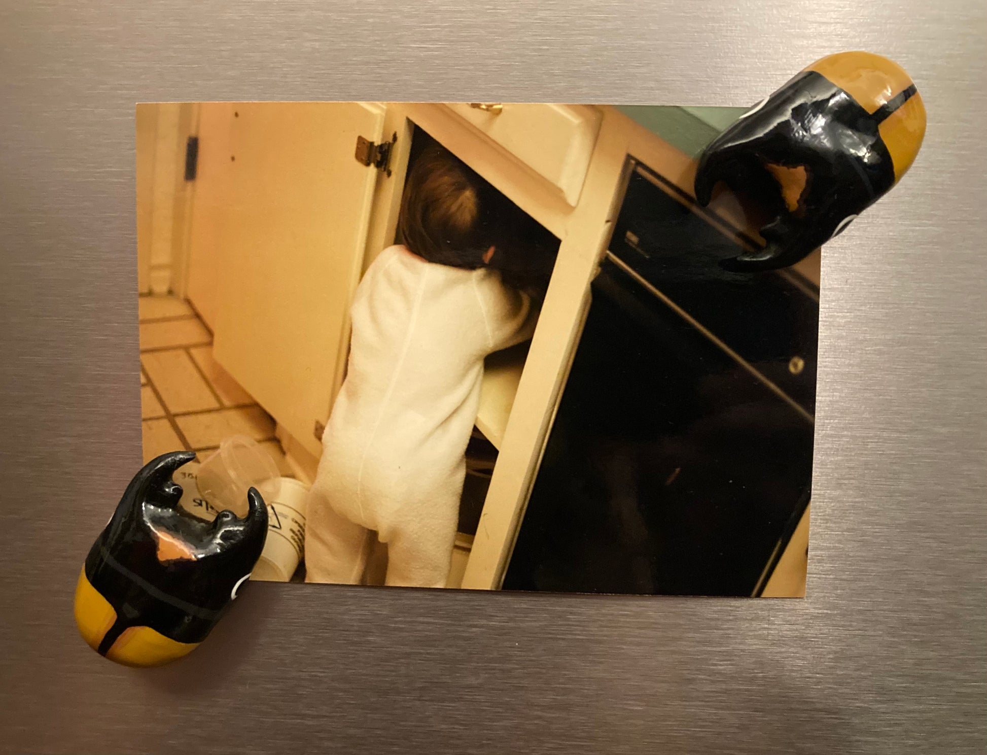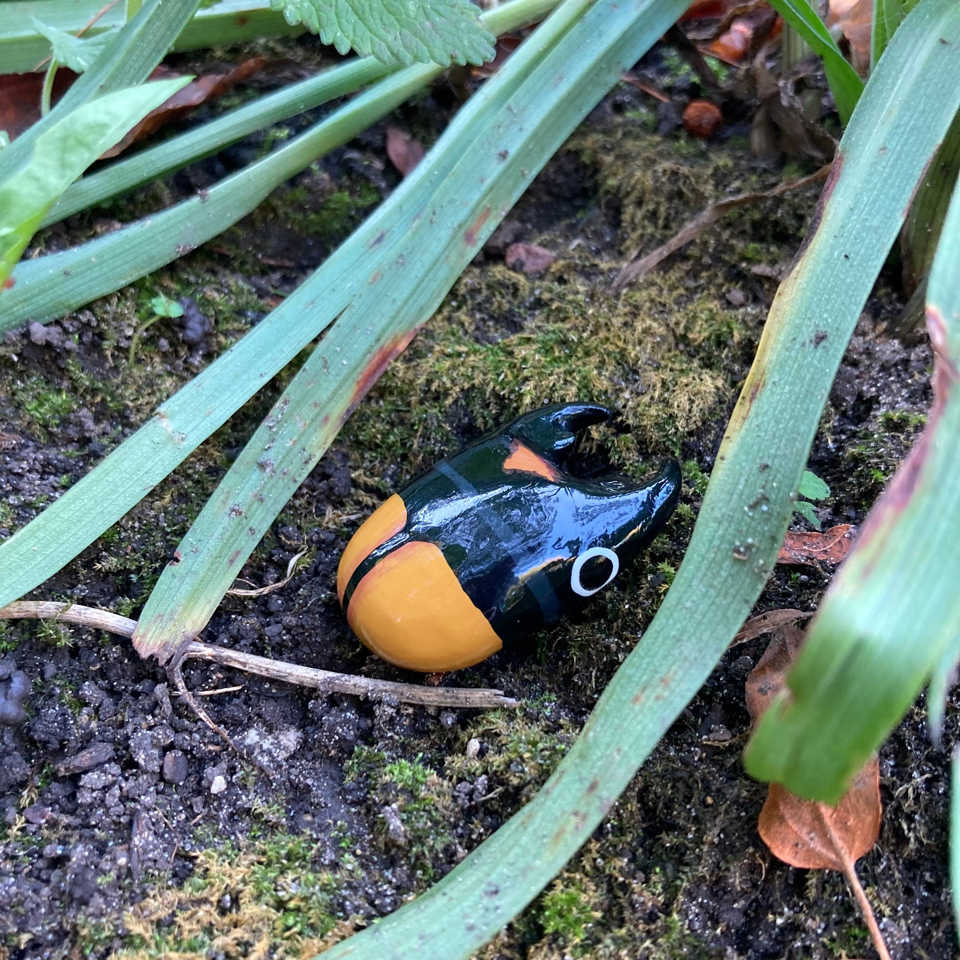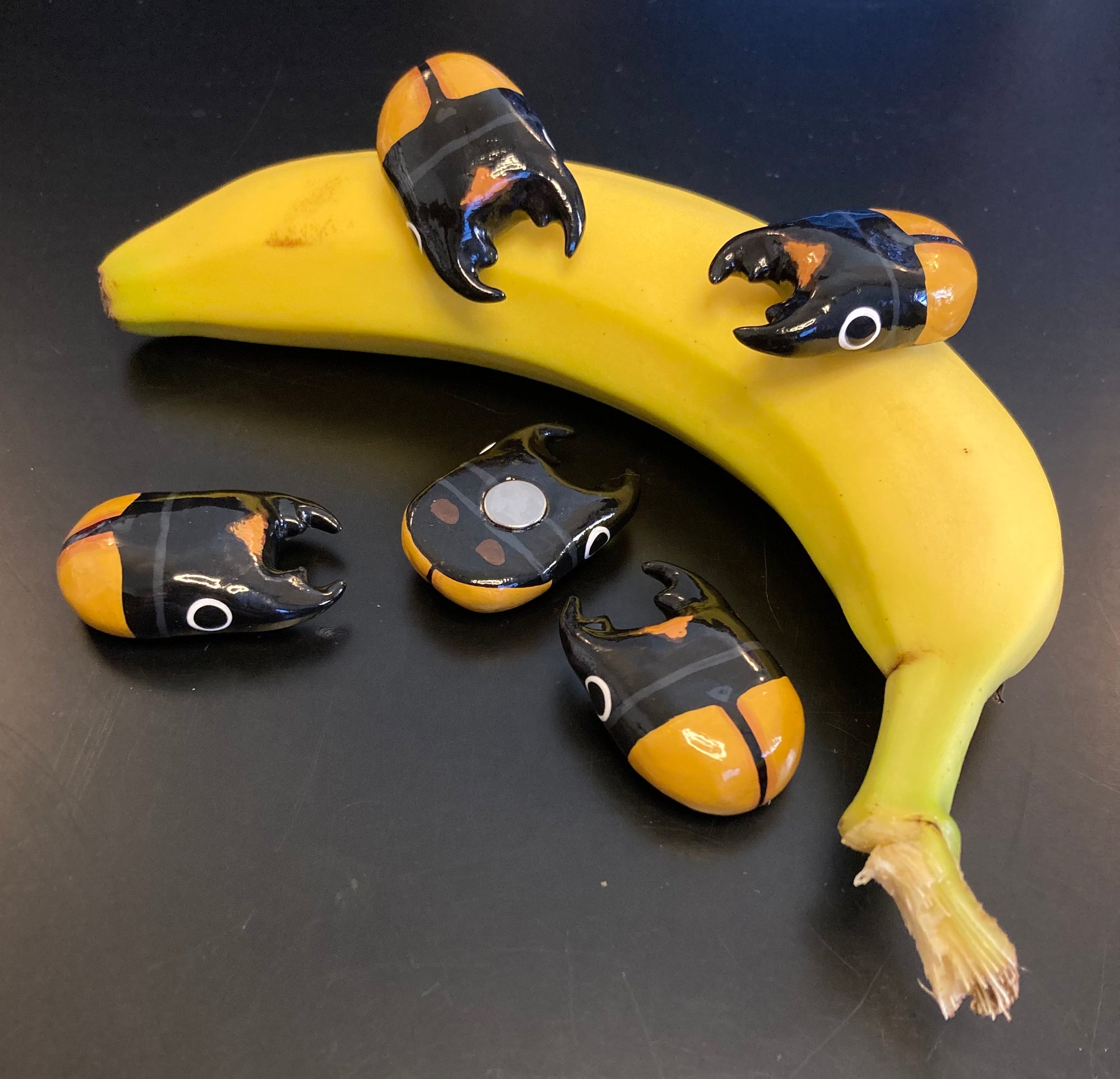 Hand-sculpted stag beetle sculptures made with polymer clay, hand-painted with acrylic paint and sealed with glossy polyurethane. Each contains one rare-earth magnet.
